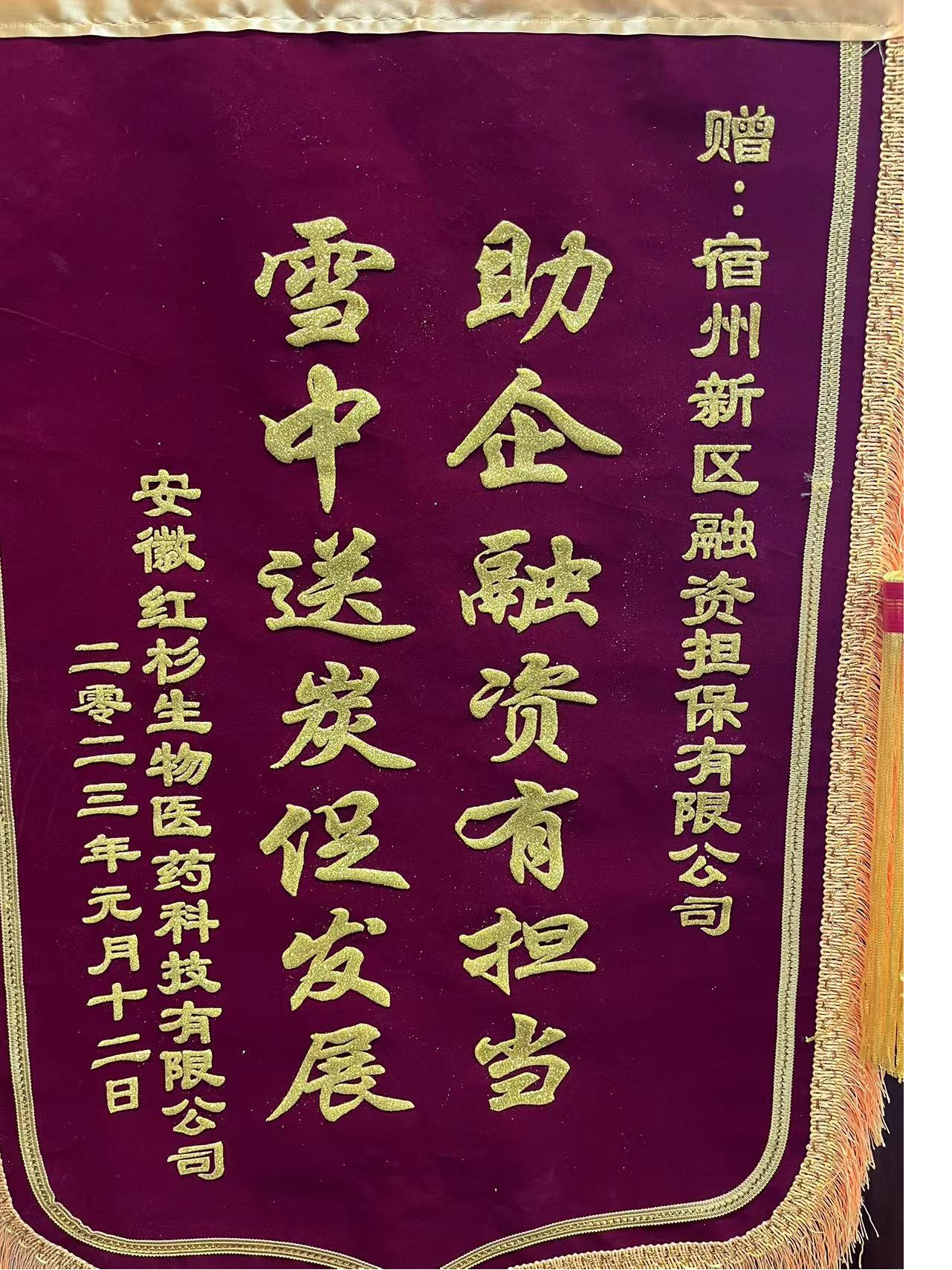近日,宿州新區(qū)擔(dān)保公司收到安徽紅杉生物醫(yī)藥公司專程送來(lái)的感謝錦旗,感謝新區(qū)擔(dān)保公司近幾年來(lái)對(duì)于企業(yè)的金融支持,在幫助企業(yè)解決融資難、融資貴問(wèn)題上,想企業(yè)之所想、急企業(yè)之所急,與企業(yè)共渡難關(guān),敢擔(dān)保、有作為,有力的支持了企業(yè)不斷發(fā)展壯大。