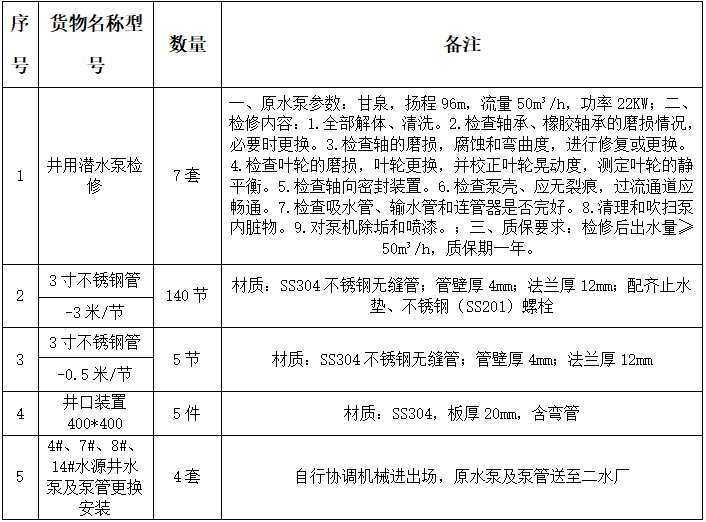 五、采購(gòu)內(nèi)容:宿州市新區(qū)水務(wù)有限公司第二水廠水泵檢修及泵管采購(gòu),技術(shù)要求: