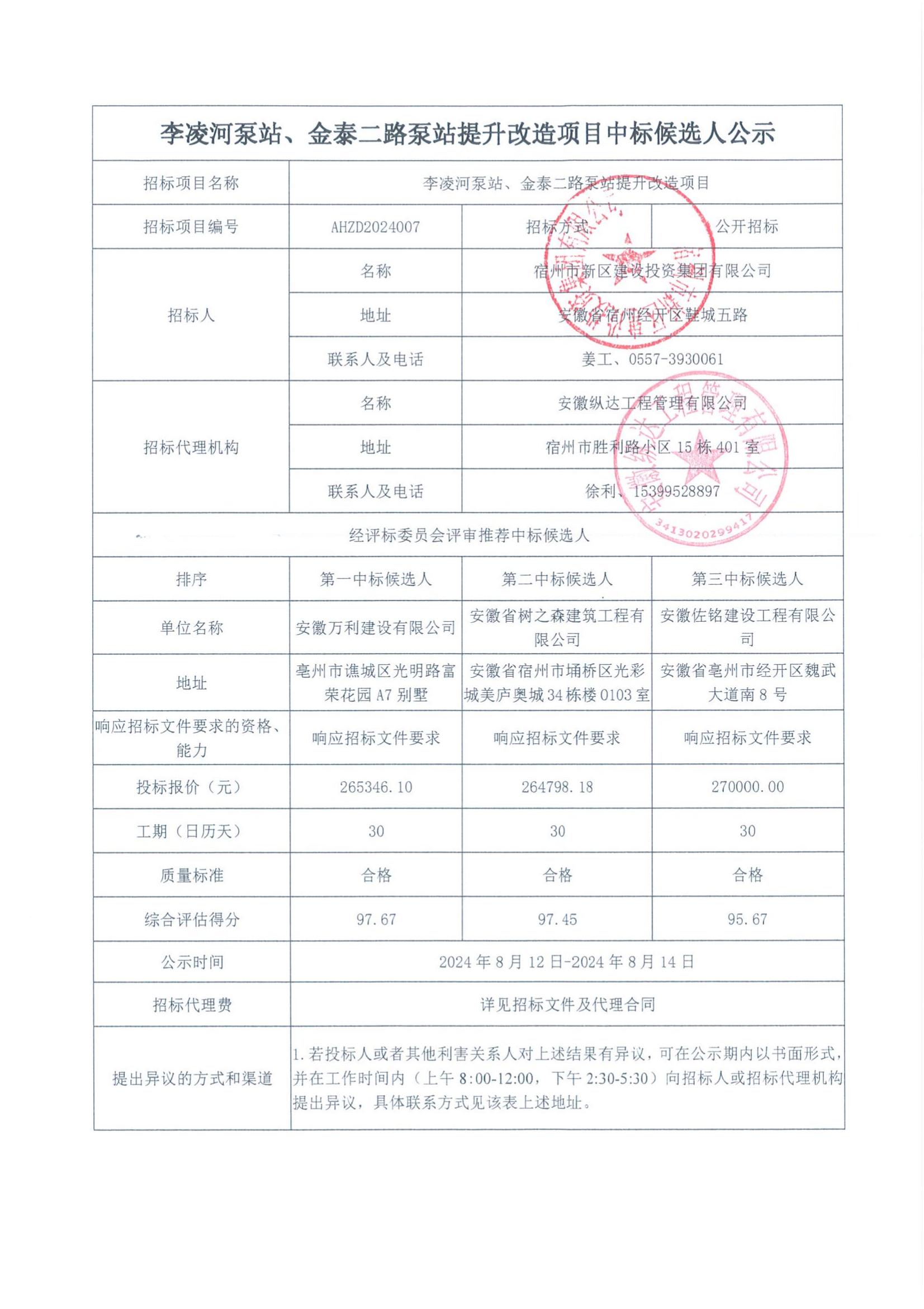 李凌河泵站、金泰二路泵站提升改造項目中標(biāo)候選人公示