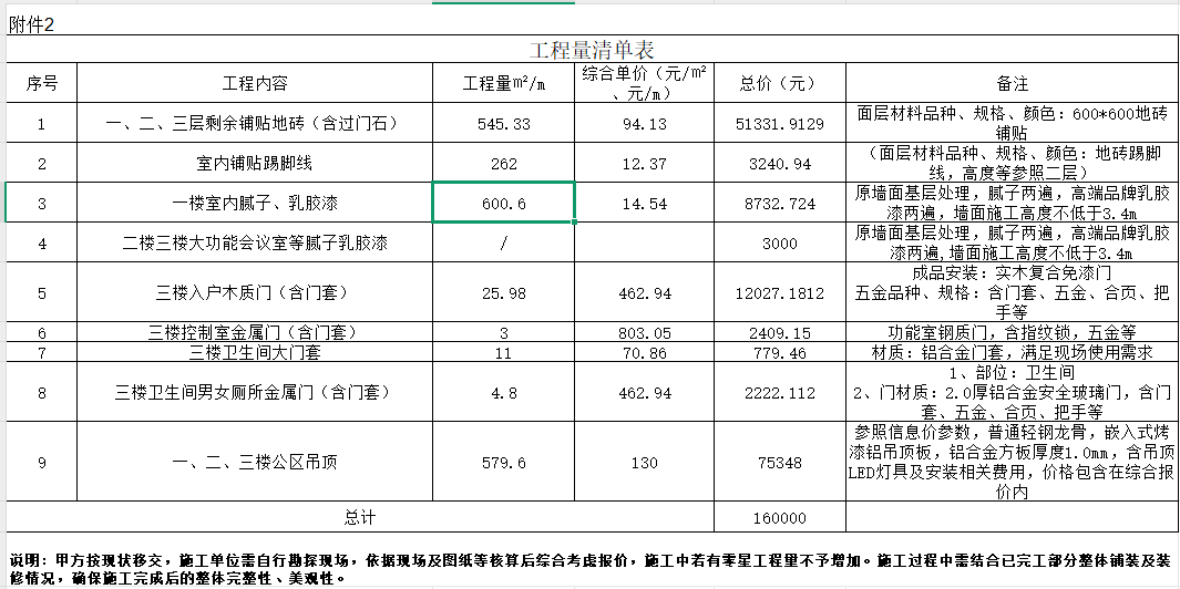 五、施工內(nèi)容:一樓室內(nèi)地面鋪貼、墻面刷白噴漆,公區(qū)吊頂及照明燈具安裝;二樓一間會(huì)議室地面鋪貼、墻面刷白噴漆,公區(qū)吊頂及照明燈具安裝;三樓公區(qū)入戶門具安裝,一間會(huì)議室地面鋪貼、墻面刷白噴漆,公區(qū)吊頂及照明燈具安裝等,具體要求詳見工程量清單、詢價(jià)函等。