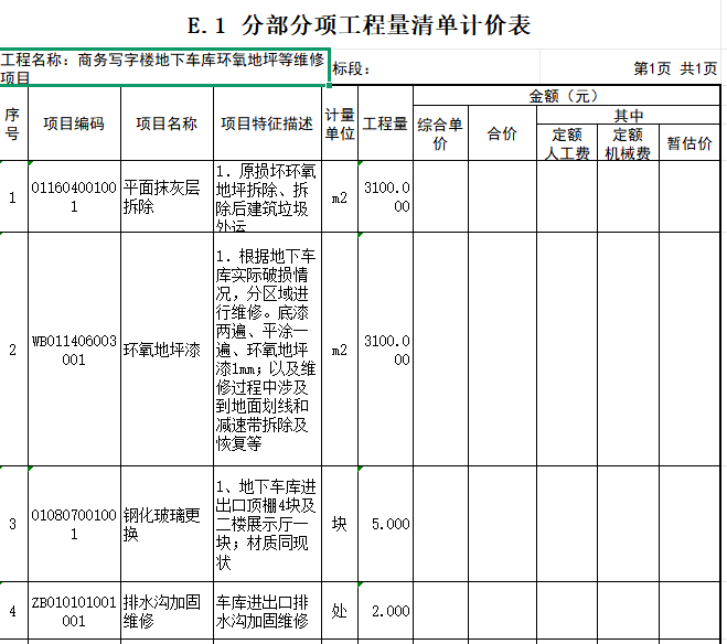 五、主要施工內(nèi)容:對商務寫字樓地下車庫破損環(huán)氧地坪維修約3100平方米(根據(jù)地下車庫實際破損情況,分區(qū)域進行維修。包含破損環(huán)氧地坪拆除、底漆兩遍、平涂一遍、環(huán)氧地坪漆1mm;以及維修過程中涉及到地面劃線和減速帶拆除及恢復)、更換地下車庫進出口頂棚及二樓展示廳破損鋼化玻璃5塊、加固維修地下車庫進出口排水溝兩處,具體要求詳見工程量清單、詢價函等。