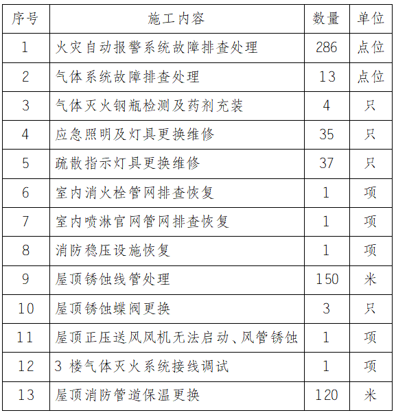 商務(wù)寫字樓3#樓消防設(shè)施維修保證整棟樓消防設(shè)施系統(tǒng)正常運(yùn)行并順利移交維保單位,要求符合國標(biāo)合格產(chǎn)品并提供2年質(zhì)保。